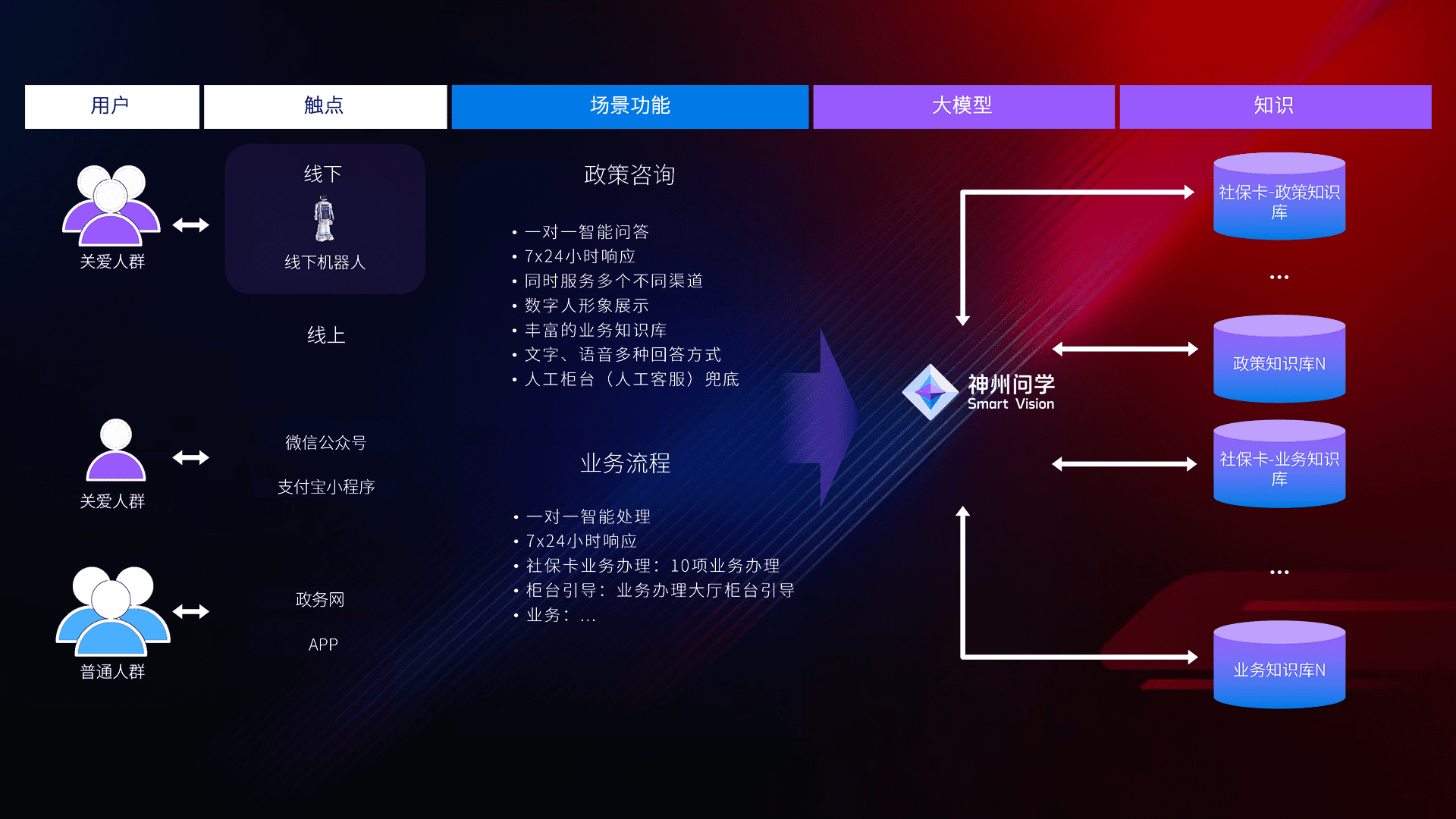 • 线上线下全覆盖:线上提供微信公众号、、、支付宝小程序、、、、政务网、、、app多种渠道,,,与线下机器人形成完整服务体系。。。