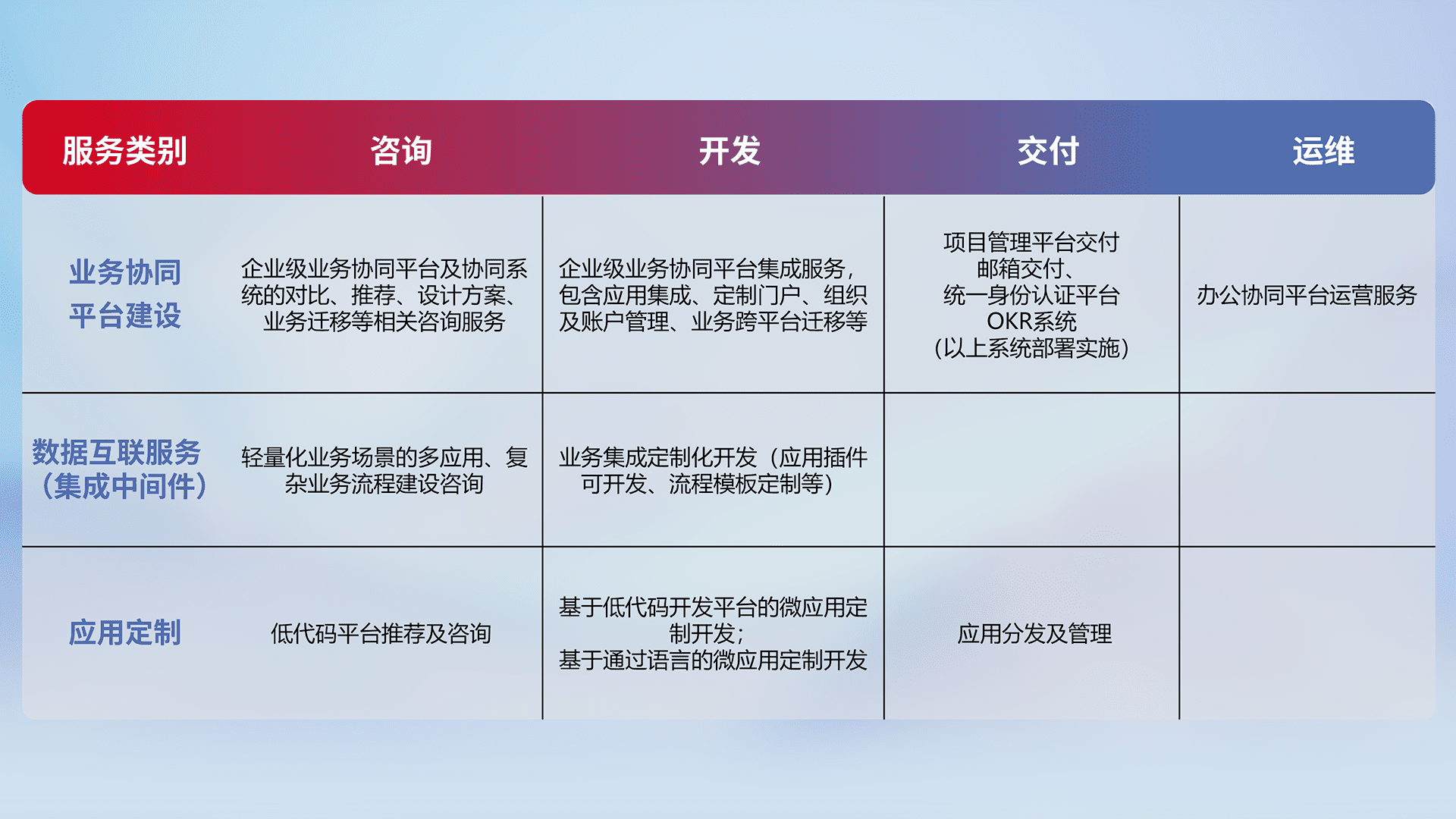 针对钉钉、、、企微、、IDaas等平台级产品提供产品的规划、、、方案、、、交付、、、定制化开发等服务,,,实现如统一协同办公、、、、智能客户服务、、、混合会议管理、、、智能数据查询、、、等业务场景,,,,实现数字化转型。。。